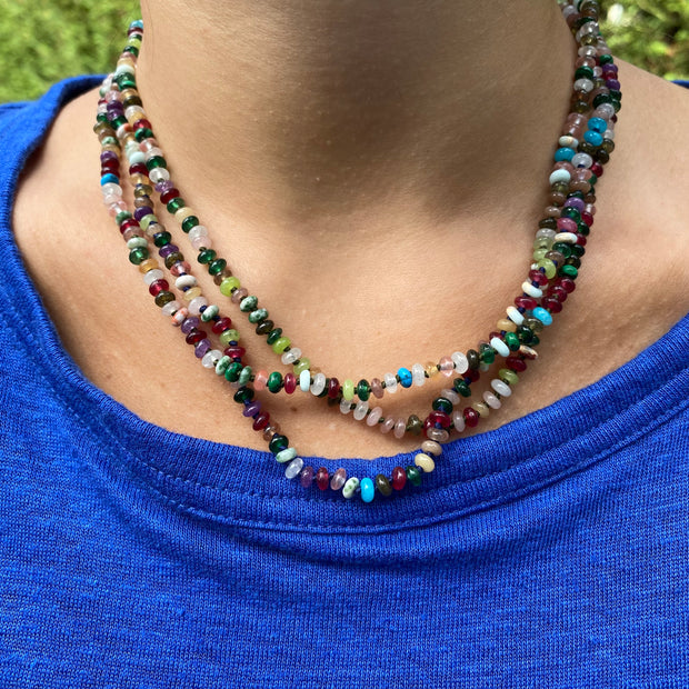 Our current  "Get Stoned" Collection pieces are perfect for layering, or a simple one to wear with a patterned shirt or concert-T! The mixed gems colors and powerful combined energies is true Jen Stock Spiritual Armor/Master Healer!