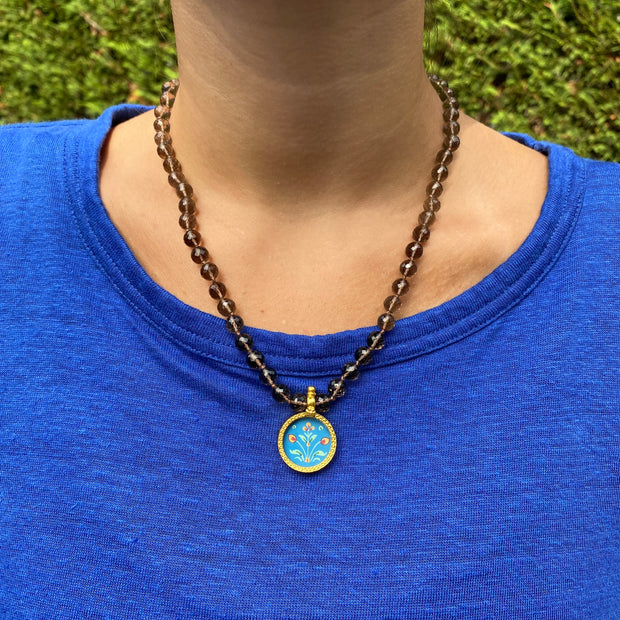 20” hand-knotted 14mm Brunette Boxwood beads with a Tibetan Silver pendant with Turquoise, Citrine and Carnelian Inlay. Artisan made in Tibet. (Images of piece alone, not ones on models)