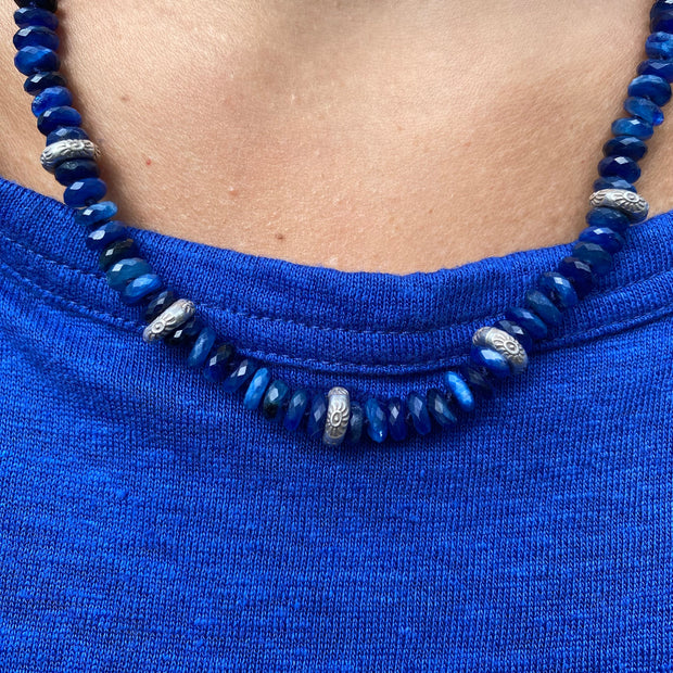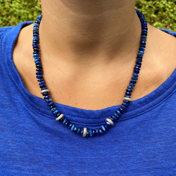 17” Hand-knotted Lapis Lazuli with 5” micro pave diamond Warrior drop.