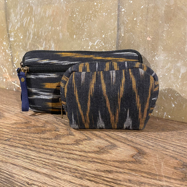 Patchwork: Side with zipper pocket and bottom is Black/Yellow/White Ikat. Other side is Purple/Blue/White Ikat.
