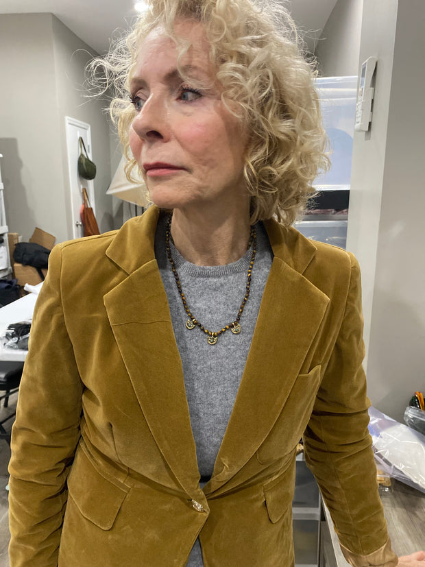 20” Hand-knotted Tiger’s Eye with 3 brass and turquoise shields.