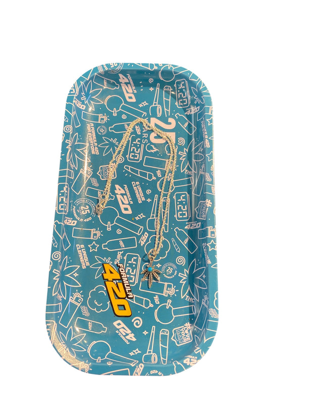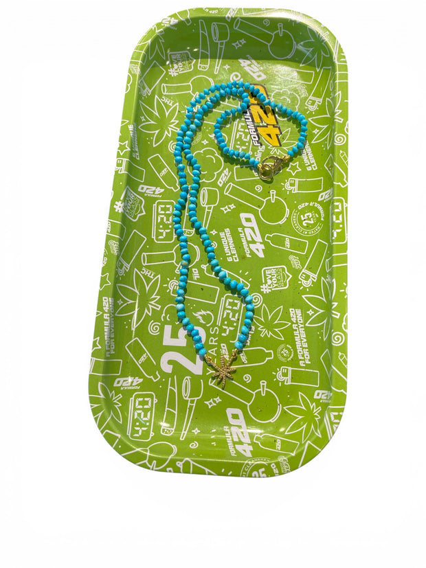 Cannabis inspired jewelry includes: 420 Sterling Silver Earrings , Turquoise & Diamond Leaf Necklace!and Sterling and blue enamel leaf with hand-knotted African Trade Beads.