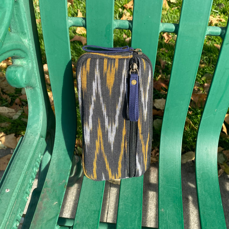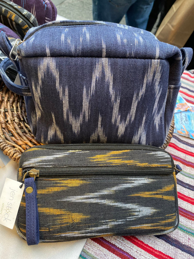 Ikat Print 100% cotton fabric (soothing Indigo Blue color) and fully carbon lined. 5 strategically placed walled pockets.